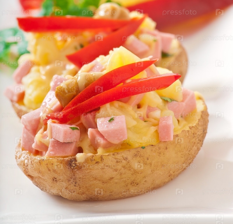 Печеный картофель с сосисками и салатом