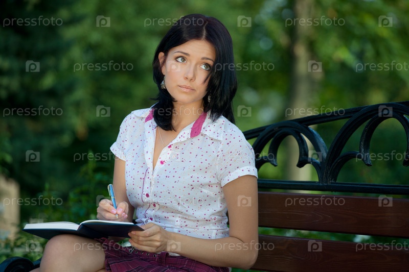 Молодая девушка, сидящая на лавочке с блокнотом в руках