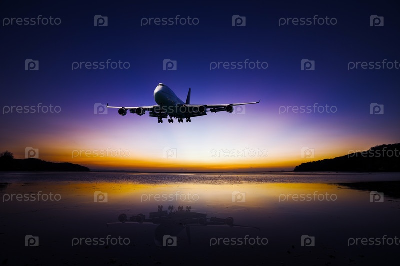 Самолет летит по красочному вечернему небу над морем на закате с отражением