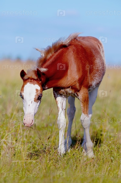 Рыже-белый жеребенок на лугу
