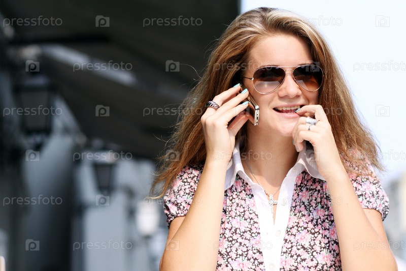 Счастливая молодая девушка разговаривает по мобильному телефону