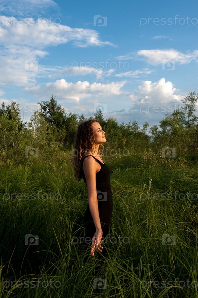 Красивая девушка идет в высокой траве