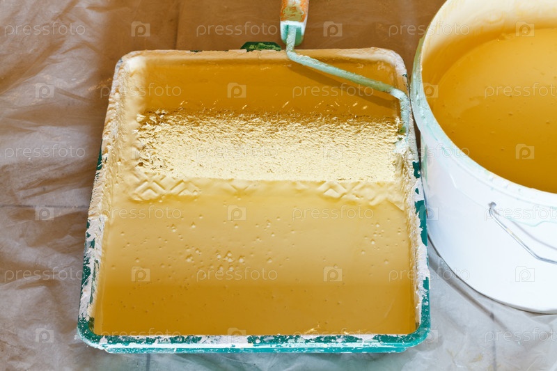 Валик и ведро с желтой краской