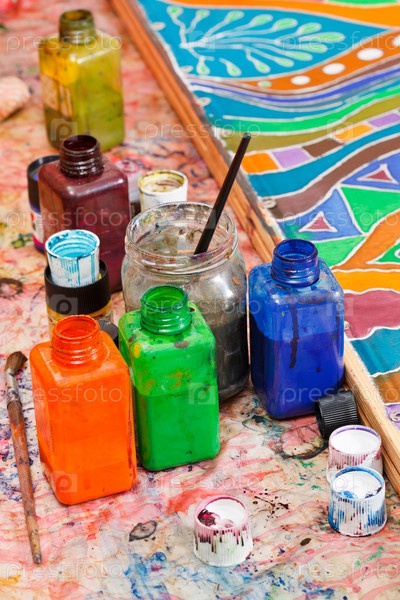Кисти, бутылки с цветными пигментами