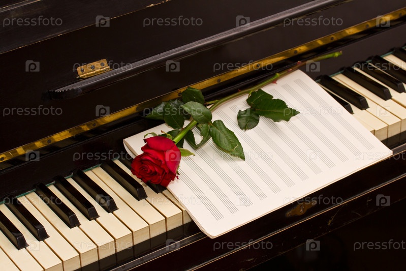 Роза с нотной бумагой на фортепиано