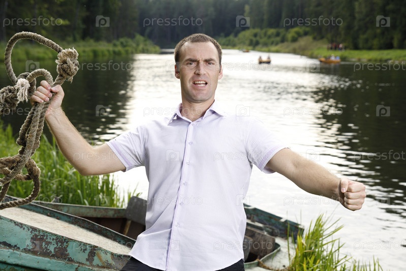 Мужчина тащит лодку