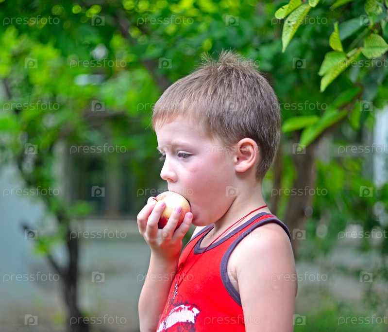 Мальчик ест яблоко