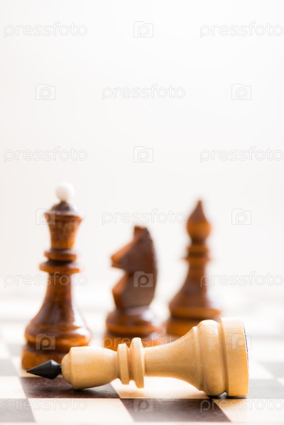 Концептуальная композиция с шахматной фигурой, стоящей над побежденным королем на шахматной доске
