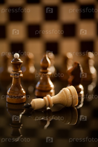 Концептуальная композиция с шахматной фигурой, стоящей над побежденным королем на отражающей поверхности