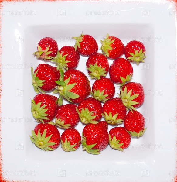 Белая квадратная тарелка, наполненная ягодами клубники