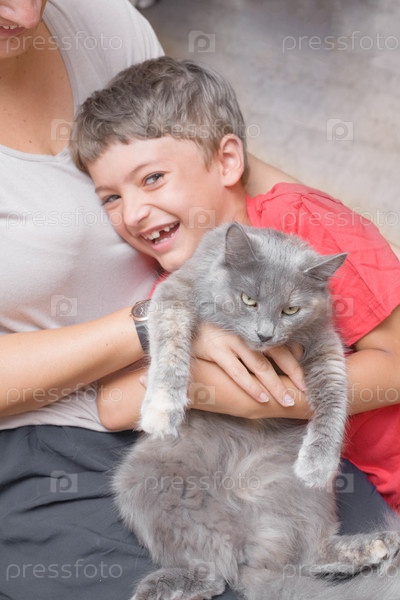 Мать и сын играют с кошкой