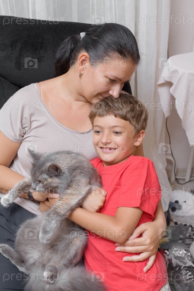 Мать и сын играют с кошкой