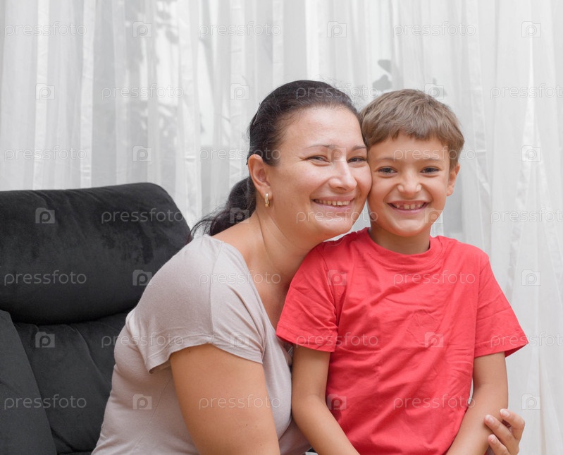 Счастливая мама и сын, обнимаются и смеются