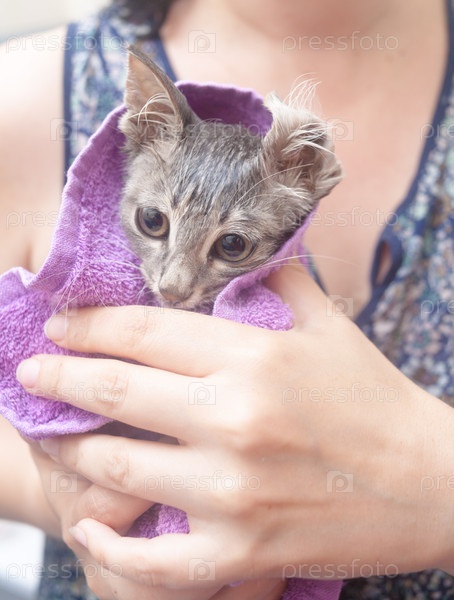Мокрый котенок в полотенце после купания