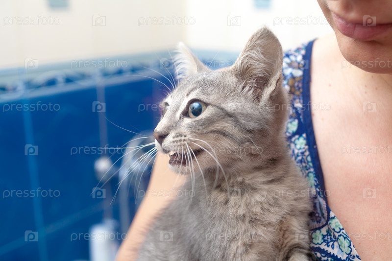 Женщины нежно обнимает котенка