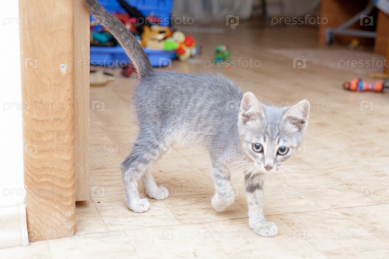 Серый котенок играет в комнате