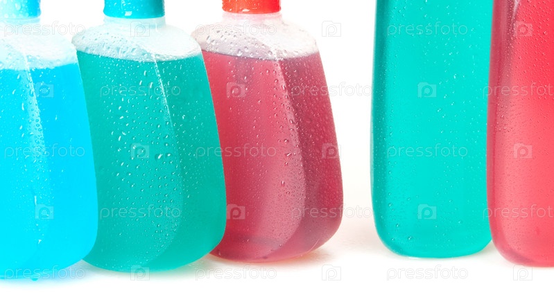 Наполненные бутылочки из-под жидкого мыла, геля, шампуня