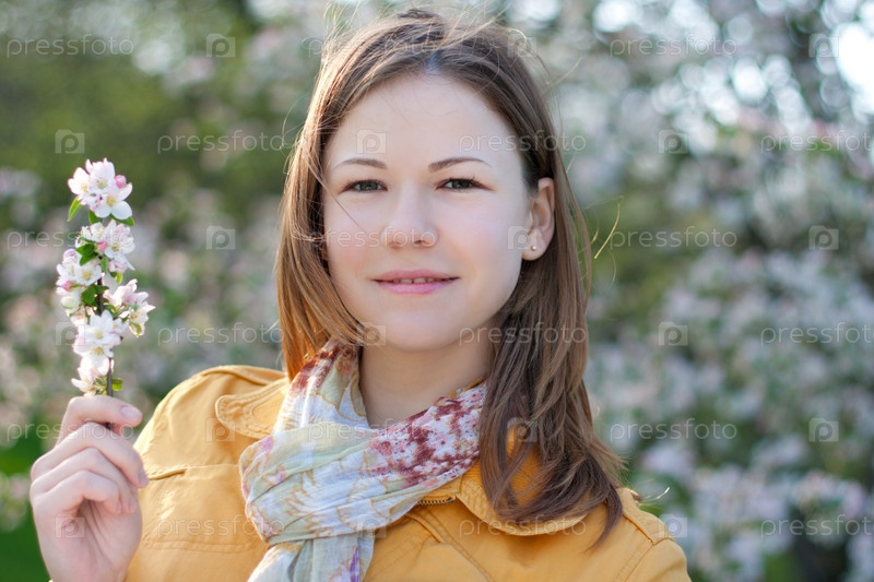 Молодая девушка с цветущей веткой в руке но фоне природы