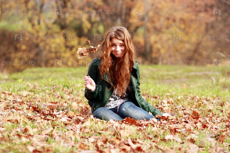 Молодая девушка, сидящая по среди опавших листьев