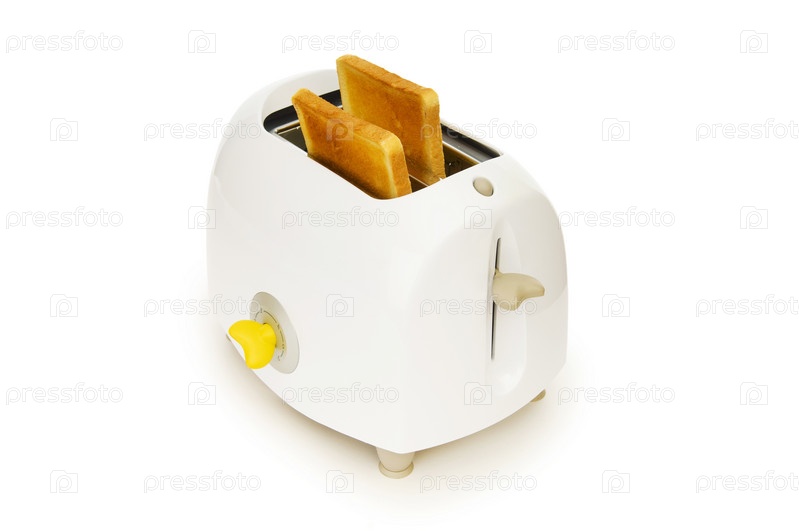 Ломтики хлеба в тостере, изолировано на белом фоне
