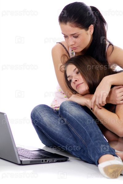 Две девушки, сидящие в обнимку у ноутбука