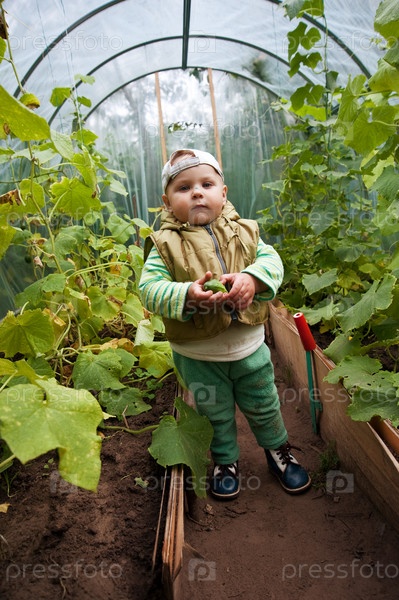 Мальчик в оранжерее с огурцами