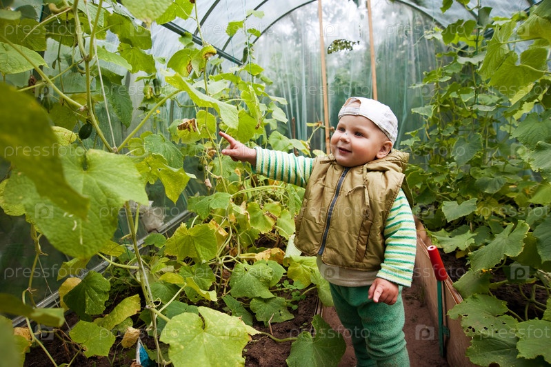 Мальчик в оранжерее с огурцами