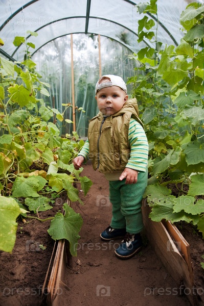 Мальчик в оранжерее с огурцами