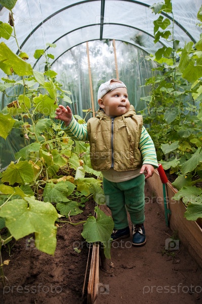 Мальчик в оранжерее с огурцами