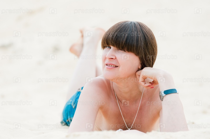Брюнетка в джинсах, лежащая на песке