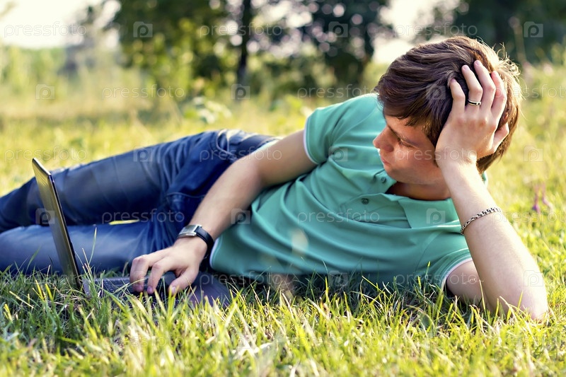 Парень смотрит на монитор ноутбука на свежем воздухе