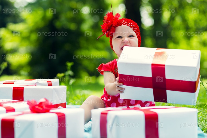 Радостная девочка с яркими подарочными коробками