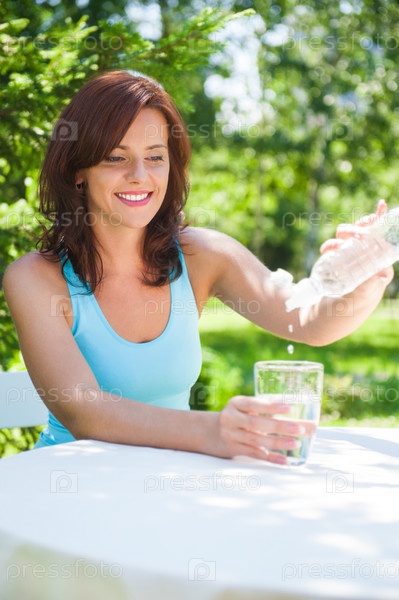 Портрет молодой красивой женщины с питьевой водой на пикнике