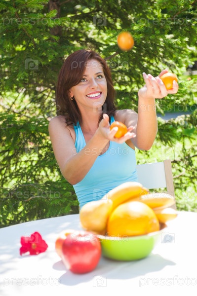 Счастливая девушка жонглирует апельсинами