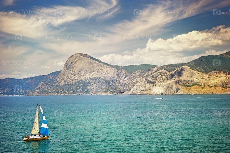 Яхта в бухте Судак на фоне гор