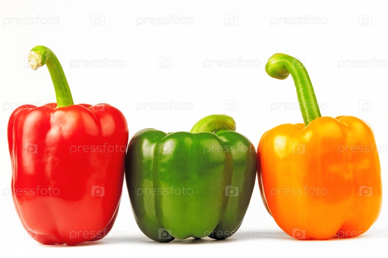 Три разноцветных перца, изолированных на белом фоне