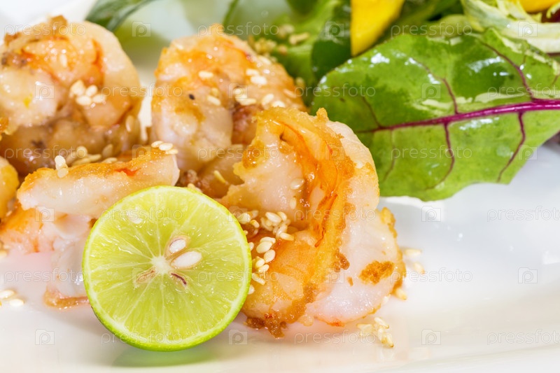 Свежий салат с жареным креветками, листьями салата, манго, апельсином и поджаренным кунжутом
