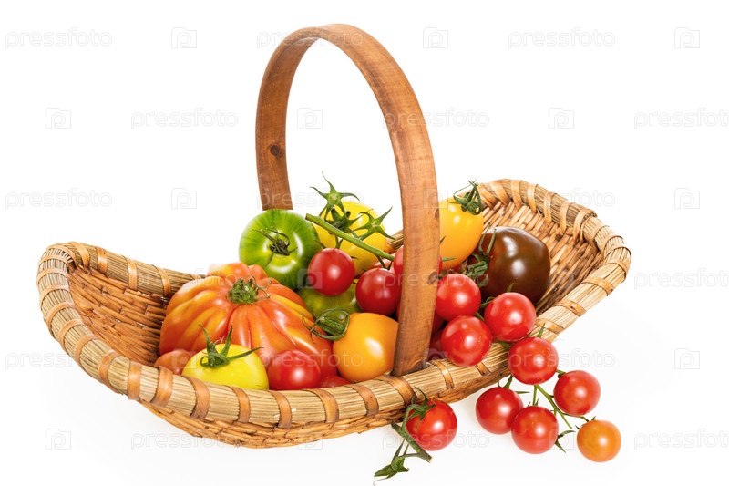 Разные красочные помидоры в корзине на белом фоне