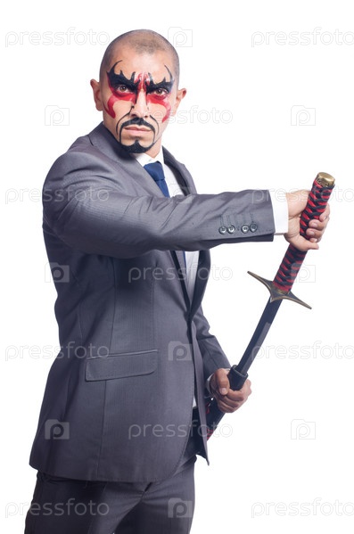 Бизнесмен с мечом, изолированный на белом