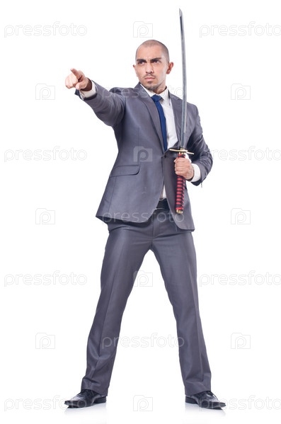 Бизнесмен с мечом, изолированный на белом