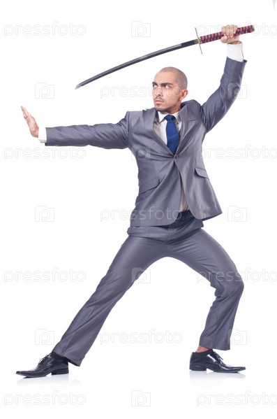 Бизнесмен с мечом, изолированный на белом