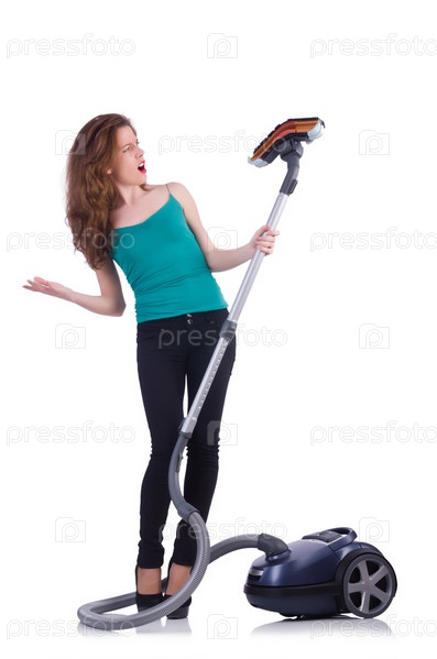 Молодая женщина с пылесосом на белом фоне