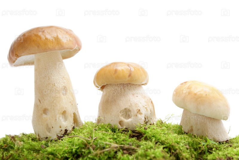 Три белых гриба на зеленом мхе