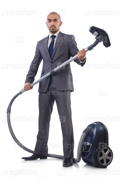 Бизнесмен делает уборку пылесосом на белом фоне