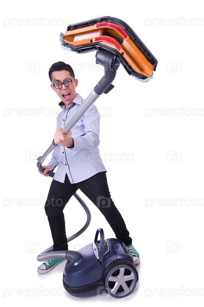 Забавный человек с пылесосом на белом