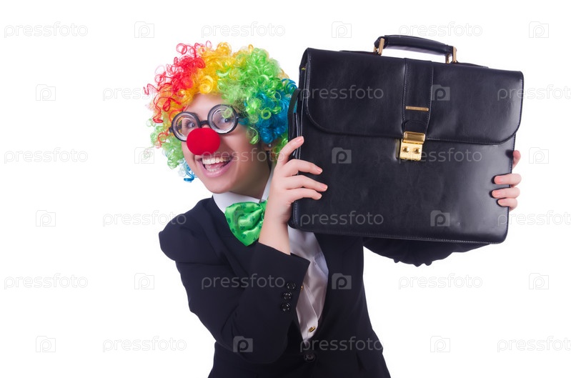 Клоунесса изображает бизнес-леди, изолированная на белом фоне