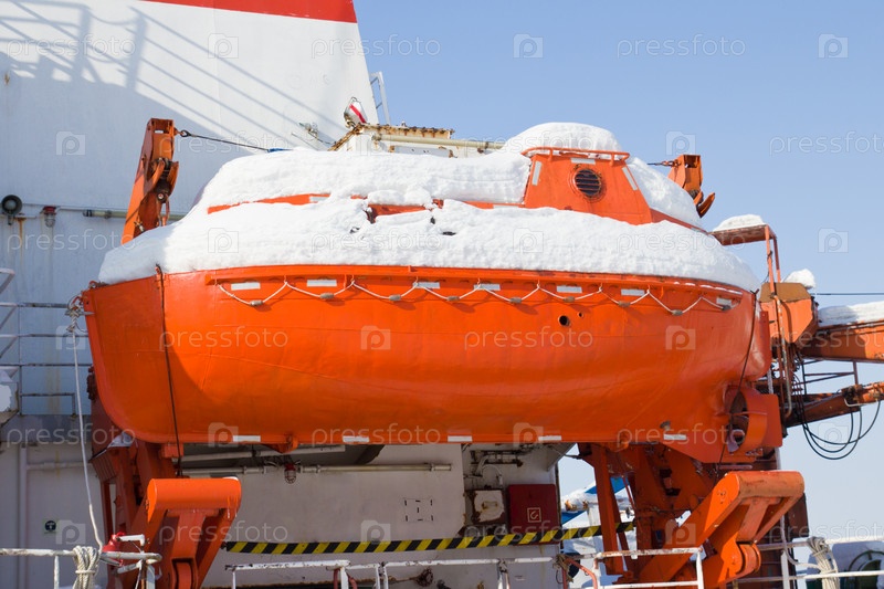Спасательная шлюпка на борту судна, покрытая снегом