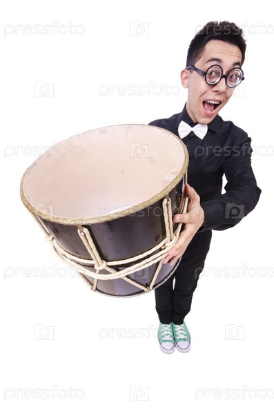 Забавный человек с барабаном на белом фоне