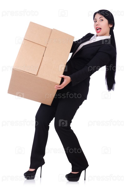 Женщина с коробкой на белом фоне