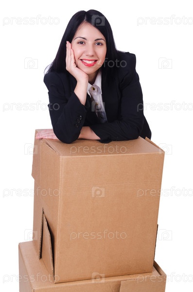 Женщина с коробками на белом фоне